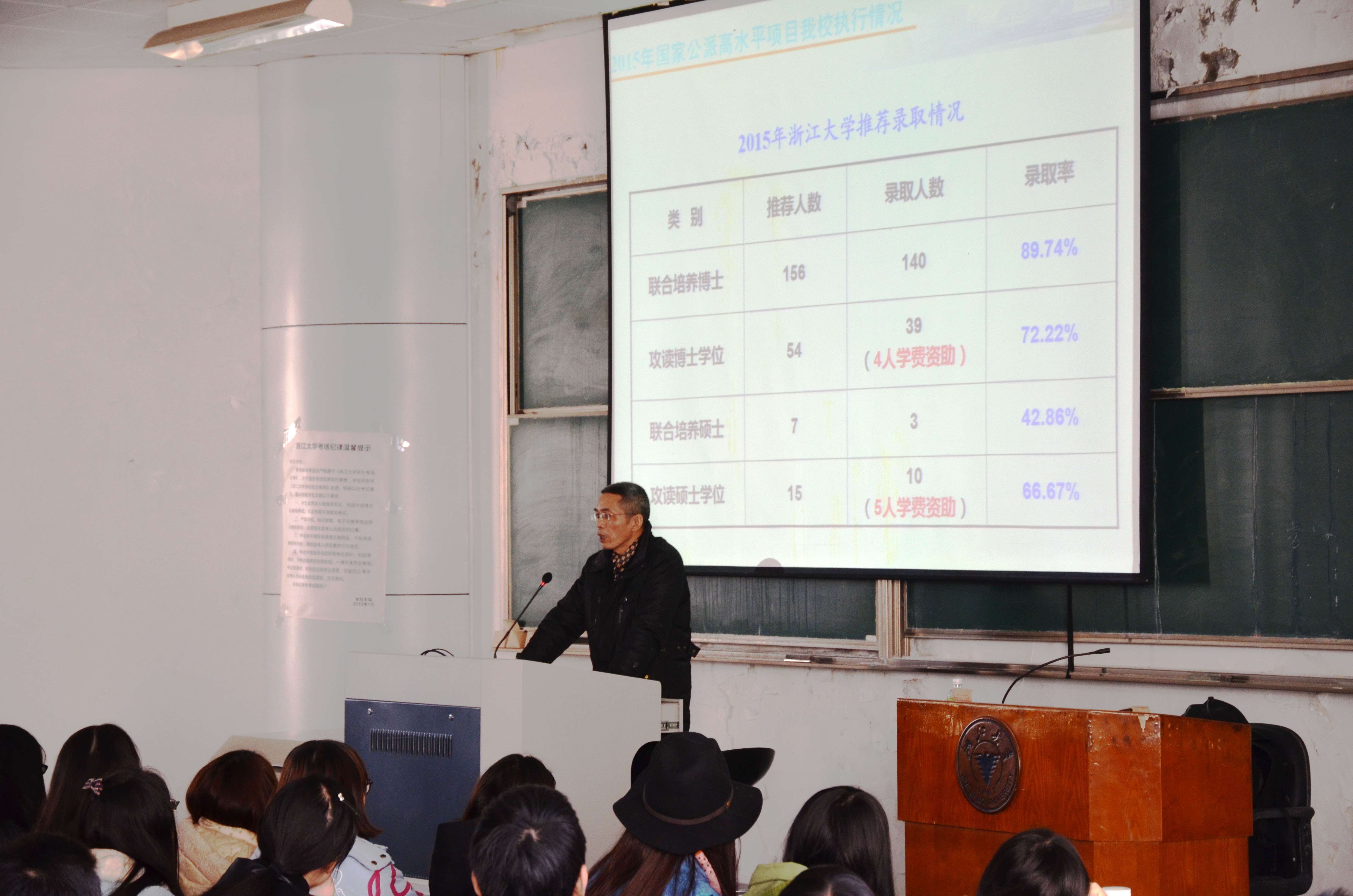 宣讲会分为三个环节。研究生院培养处处长叶恭银教授首先回顾了浙江大学2015年国家公派研究生项目的执行情况,2015年我校国家公派研究生项目共推荐232人,录取192人;其中高水平项目联合培养博士研究生类别推荐共156人,录取140人,推荐及录取比例在C9高校中均位居前列。叶教授还对国家公派研究生项目的总体派出国家与高校分布以及各学科的比例分布做了具体的说明。同时,叶教授与同学们分享了浙江大学国家公派9年来的可喜成绩与经验教训,并希望浙大同学们充分利用国家公派的渠道,到国外去学习知识、扩大视野、增进中外交流。之后,叶教授详细介绍了该项目2016年的相关政策和申报流程,并着重强调了与2015年相比有所变化的要求和细则。叶教授以自己的丰富经验和切身体会鼓励同学们要积极争取到国外一流的科研院校,师从一流的导师,做出一流的科研成果,为浙大做好宣传,为浙大与国外高校的交流搭好桥梁,为浙大争创世界一流做出贡献。最后,研究生院公派出国办刘多老师对往年申报中的常见问题做了重点提示,介绍了学校及国家层面的可利用合作渠道,并就往年遇到的典型案例做出特别说明,供同学们参考。