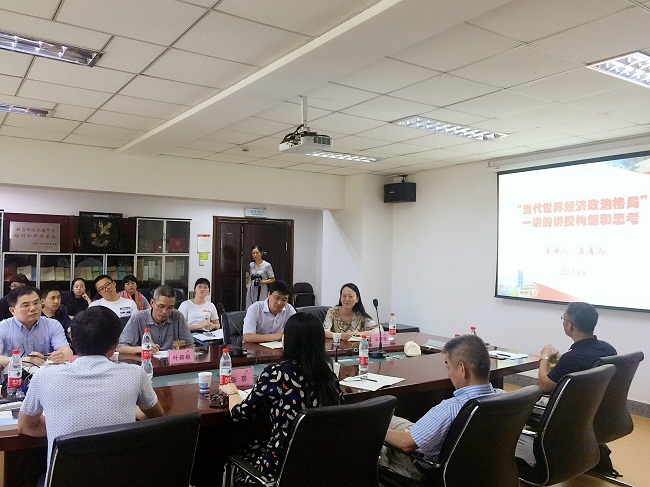 教学论坛的第二阶段,由马克思主义学院吕有志教授就“当代世界经济政治格局”这一教学专题进行了示范性教学,吕有志教授与参会教师分享了这一讲的教学要求、教学内容、教学重点和难点、几个重要问题的理解和把握等,并着重提出,要运用马克思主义的立场、观点和方法分析当代世界经济政治格局发生的深刻变化及趋势,着重把握十八大以来中国对外战略和大国外交的基本内容,特别关注经济全球化和逆全球化、人类命运共同体的外交理念、和平发展道路等重点内容。参会的教师都觉得这样的集体备课、集中讨论收获很大,受益匪浅。教学论坛持续了三个小时才结束。