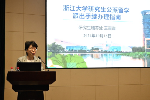 随后,研究生培养处处长王青青向师生们介绍了行前的重要准备工作以及浙江大学研究生公派留学派出手续,并就学生关心的学籍异动、在外管理、财务手续办理等问题作了重点解读。王青青希望同学们珍惜公派留学的机会,赴世界一流大学或科研机构,师从一流导师,坚守爱国主义精神,勤奋学习,勇于实践,力争学有所专、学有所成、学有所用,为中国式现代化贡献浙大力量。