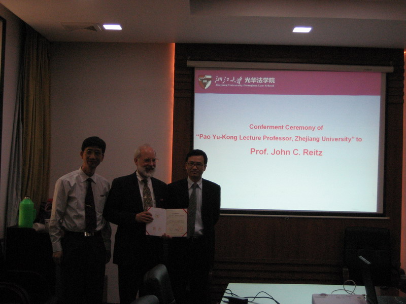 On the morning of May 20.2008, Professor John C. Reitz, Edward Carmody Professor of Law and Associate Dean of the University of Iowa College of Law, USA, was appointed as Pao Yu-kong Lecture Professor of Zhejiang University at Zhijiang Campus. Deputy Dean of academic affairs and Deputy General Dean of graduate school Jianhua Yan and Dean of Guanghua Law School Xiaoxia Sun attended the appointment ceremony.