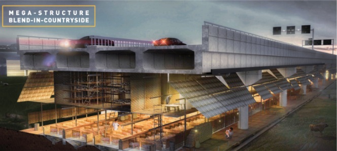 Students wereinspired by the Changshen Highway, an indispensable artery operating from thenorth to the south of Zhejiang Province, that facilitates urban development.This resulted in the vision of “Mega-Structure Blend-In-Countryside”.Influenced by their belief that high-speed overpasses can co-exist in harmonywith the countryside landscape, the students integrated agricultural and publicactivities in the space under the viaduct. With much of the sunlight blockedout by the overhead viaduct, the space was observed to be well suited foractivities of low-lighting demand.