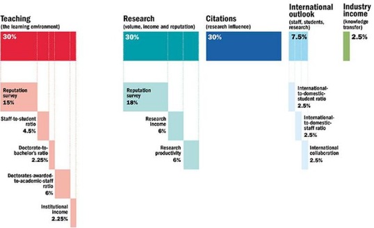 Accordingto THE, the rankings focus on five key areas. Thirty percent of the overallscore is based on teaching, 30 percent from research, 30 percent from citationimpact, 2.5 percent from industry income and 7.5 percent from the internationaloutlook. A list of over 1000 top institutions in the world are included inthe rankings.