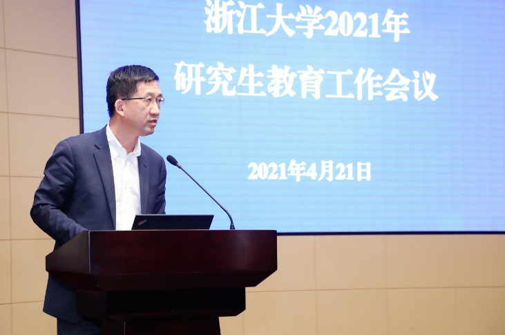 On the morning of April 21, the 2021 Graduate Education Working Conference at ZJU was held in the Linshui Lecture Hall of Zijingang Campus, Zhejiang University. Member of the CPC Committee and Vice President of ZJU Yan Jianhua, Deputy Secretary of the CPC Committee of ZJU Wu Xiaocheng attended the conference and delivered speeches. The conference was presided over by Bao Gang, Dean of Graduate School.